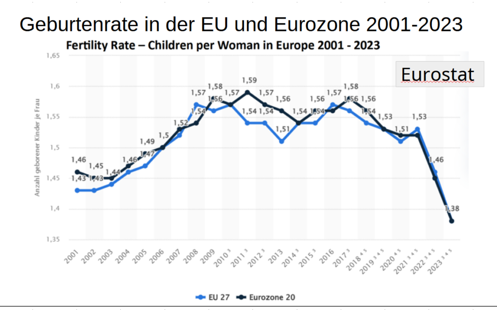 Die Geburtenrate sank in Österreich in wenigen Jahren von 1,5 Lebendgeburten pro Frau auf 1,3 ab. Bis auf wenige Ausnahmen passierte diese rapide Trendwende in allen europäischen Ländern gleichzeitig im Jahr 2022, ziemlich genau 9 Monate nach Beginn der Impfkampagne und hält bis heute an. Eurostat machte im Frühjahr 2025 bereits darauf aufmerksam (siehe Graphik).